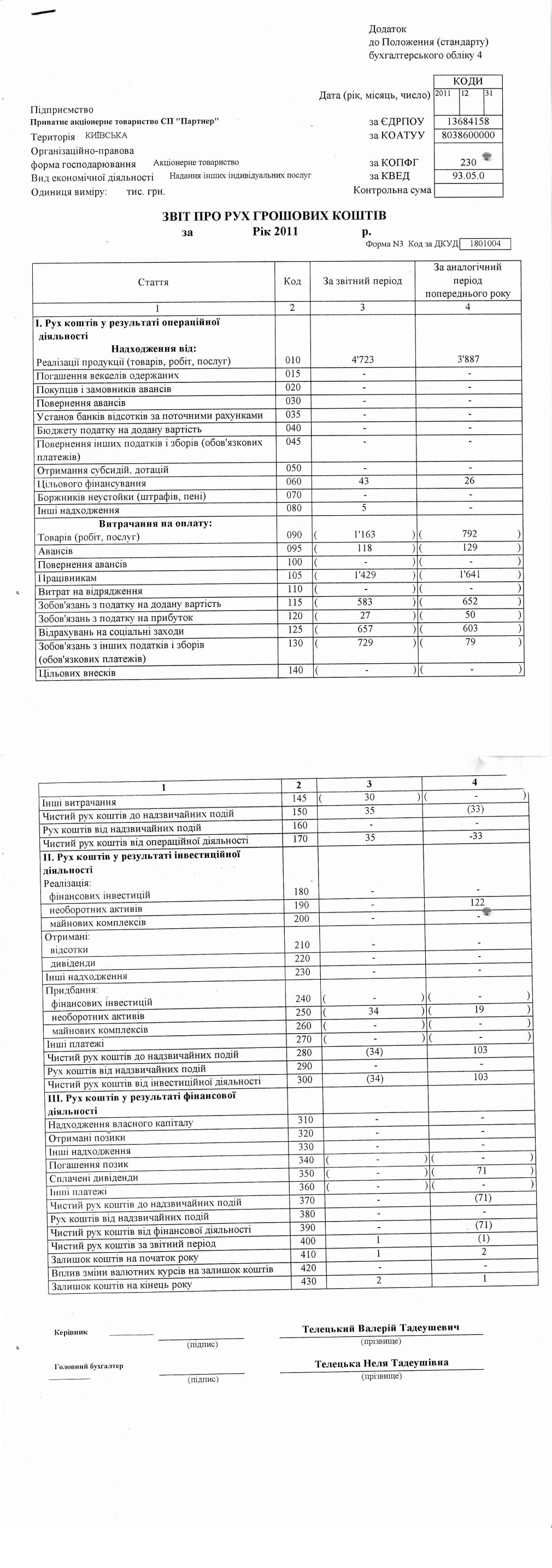 Звіт про рух грошових коштів 2011