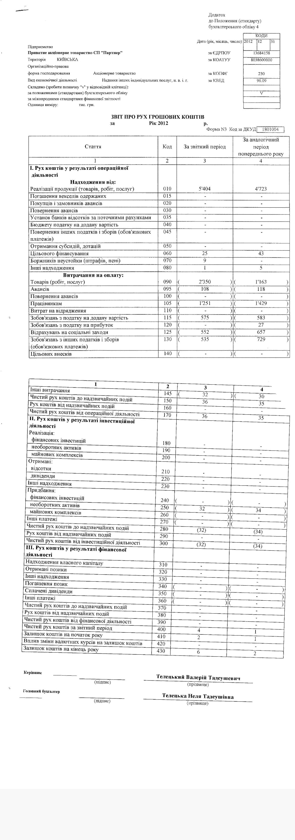 Звіт про рух грошових коштів 2012
