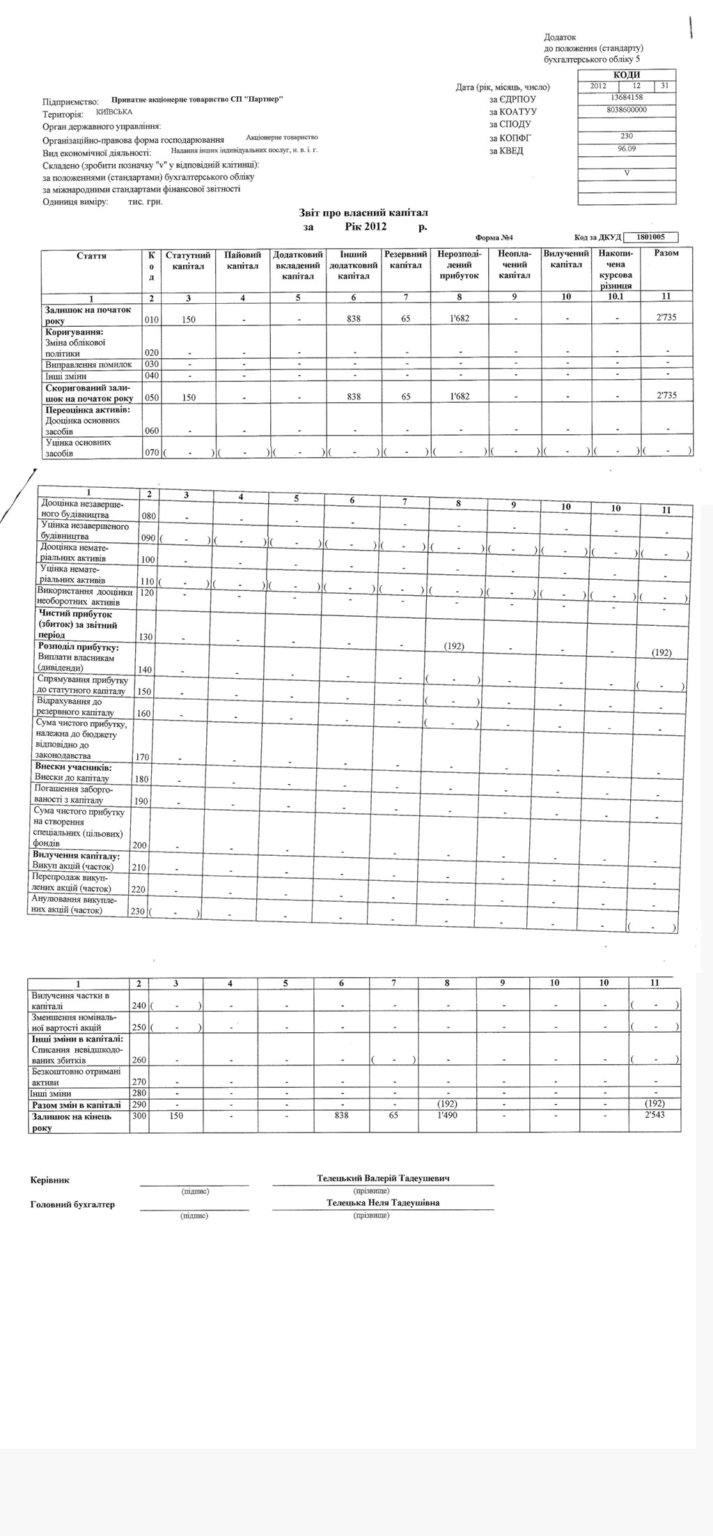 Звіт про власний капітал 2012